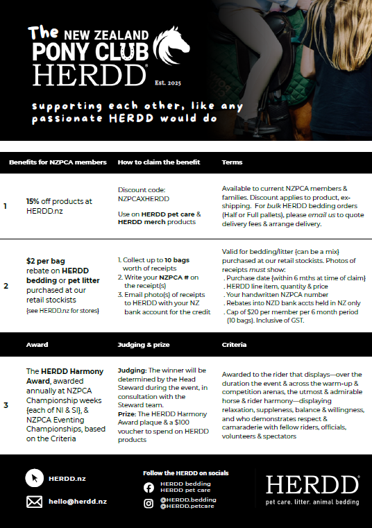 NZPCA is proud to partner with HERDD, a New Zealand brand dedicated to quality animal care, bedding, and rider centred values. Through this partnership, NZPCA members receive a fifteen per cent discount on HERDD products using the NZPCAXHERDD code, and access to a rebate programme for HERDD bedding and pet litter purchased at retail stockists.